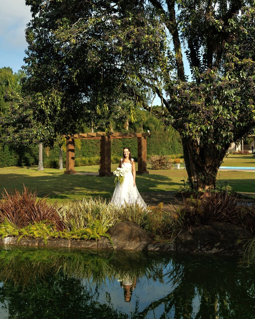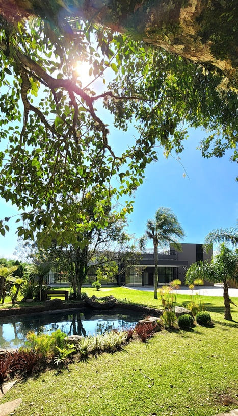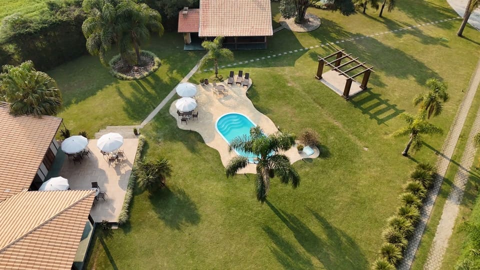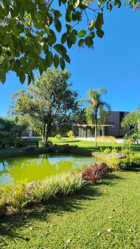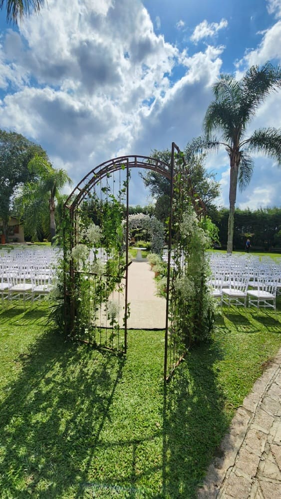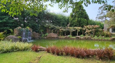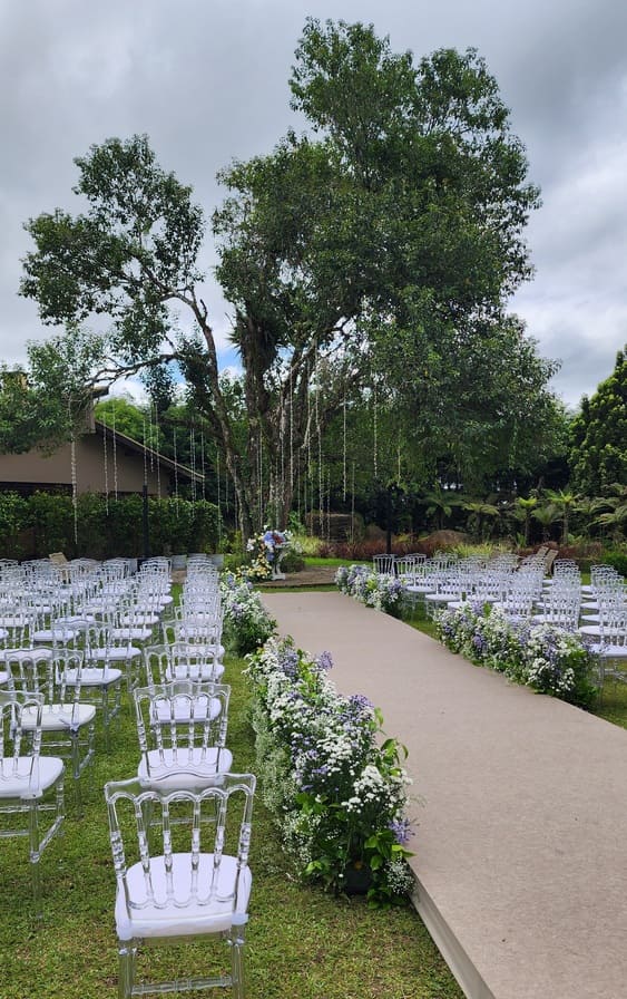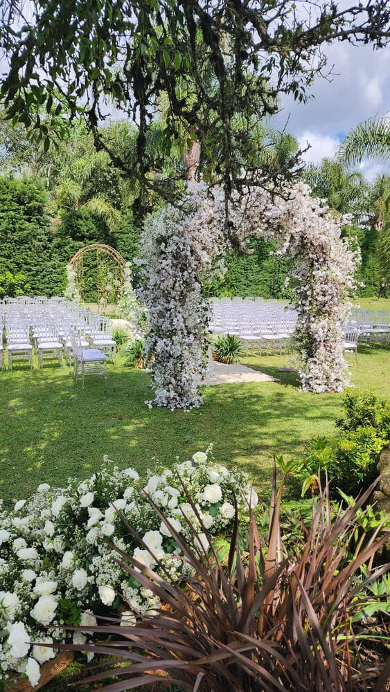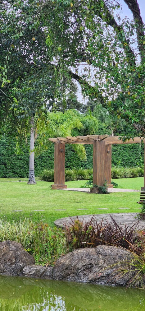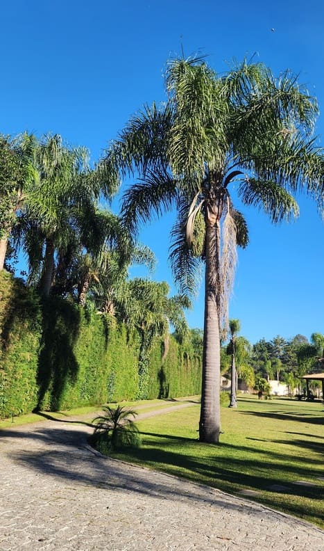 Belíssima área verde com 10.000 m2 totalmente plana, gramada e circundada por cedros e palmeiras, oferecendo opções cenográficas charmosas para cerimônias e eventos ao ar livre.