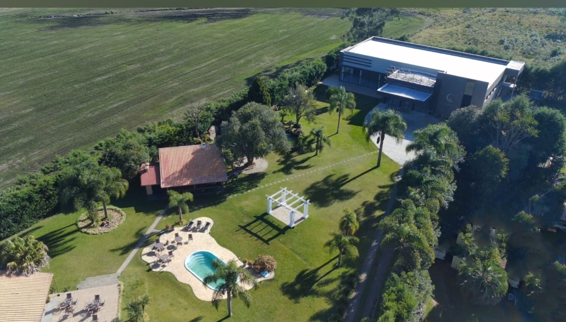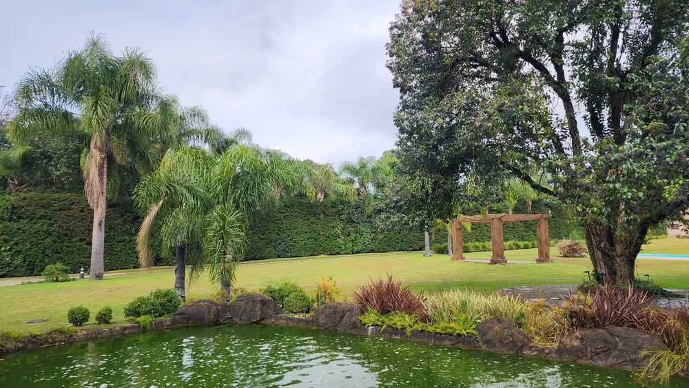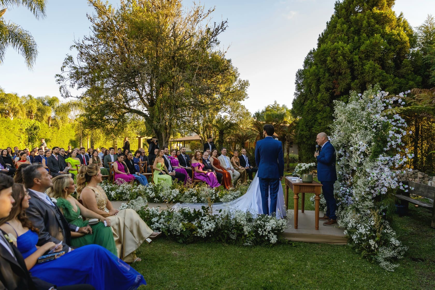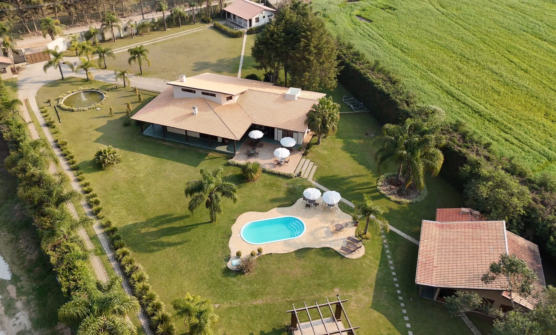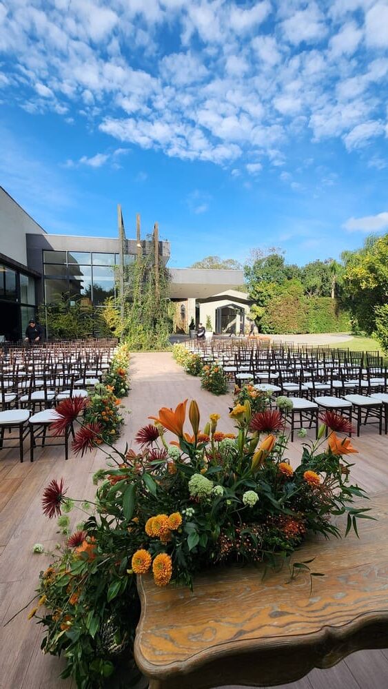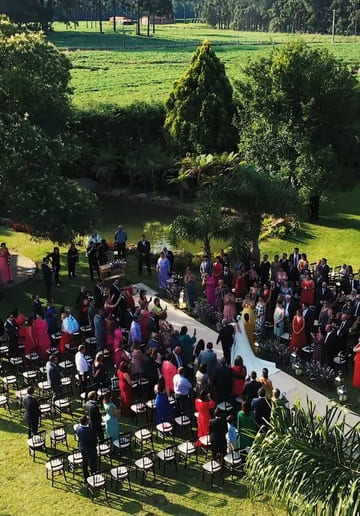 Belíssima área verde com 10.000 m2 totalmente plana, gramada e circundada por cedros e palmeiras, oferecendo opções cenográficas charmosas para cerimônias e eventos ao ar livre.